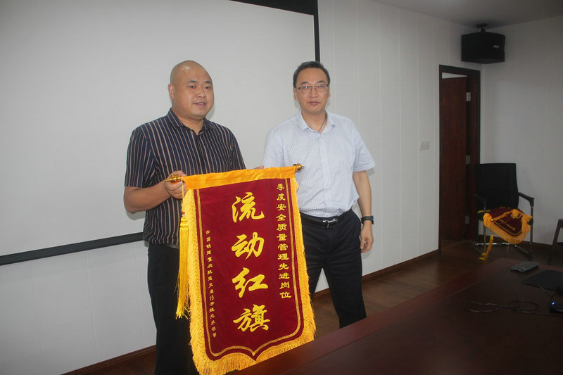 總承包部黨工委副書記王向平(右)給獲總承包部二季度“安全質(zhì)量管理先進(jìn)崗位”授錦旗