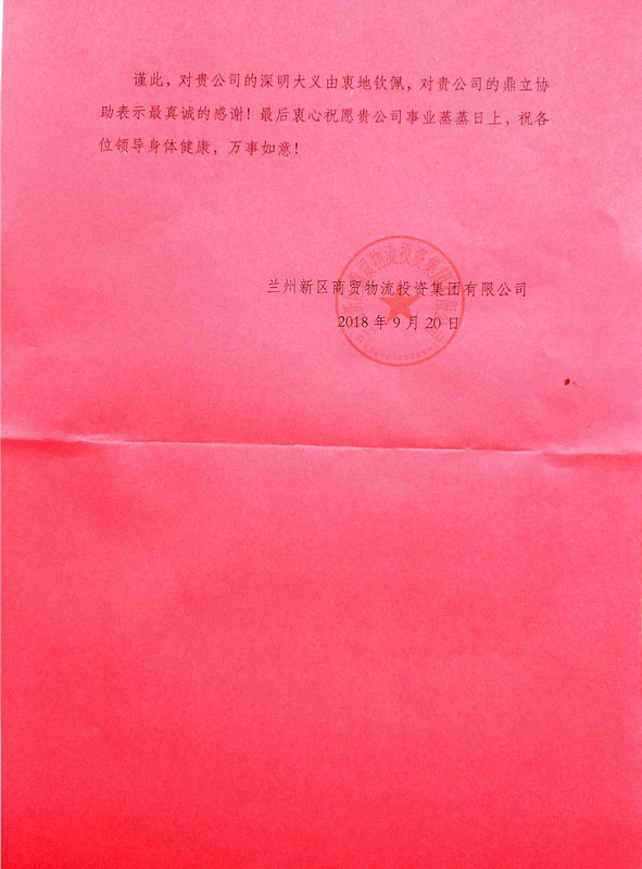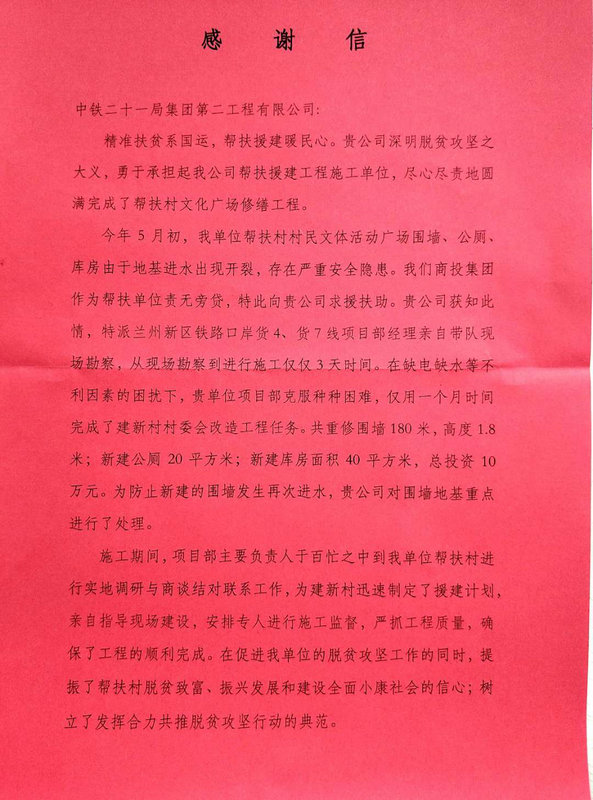 信中指出:精準扶貧系國運,幫扶援建暖民心。貴公司深明脫貧攻堅之大義,在接到救援扶助信后,特派蘭州新區(qū)鐵路口岸貨4、貨7線項目部,在項目部副經理劉明兒的親自督導下,僅用3天時間便完成了對建新村村委會的改造工程任務。共重修圍墻180米、新建廁所20平米、新建庫房40平米,總投資10萬元。項目部主要負責人于百忙之中到我單位幫扶村進行實地調研與商談結對聯(lián)系工作,為建新村迅速制定了援建計劃,在促進新區(qū)商貿物流投資單位脫貧攻堅工作的同時,提振了幫扶村脫貧致富、振興發(fā)展和建設全面小康社會的信心,樹立了發(fā)揮合力共推脫貧攻堅行動的典范。