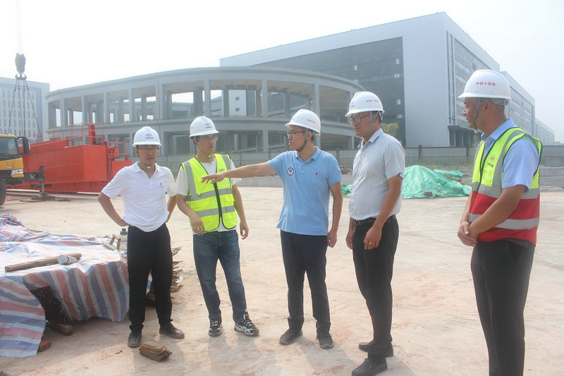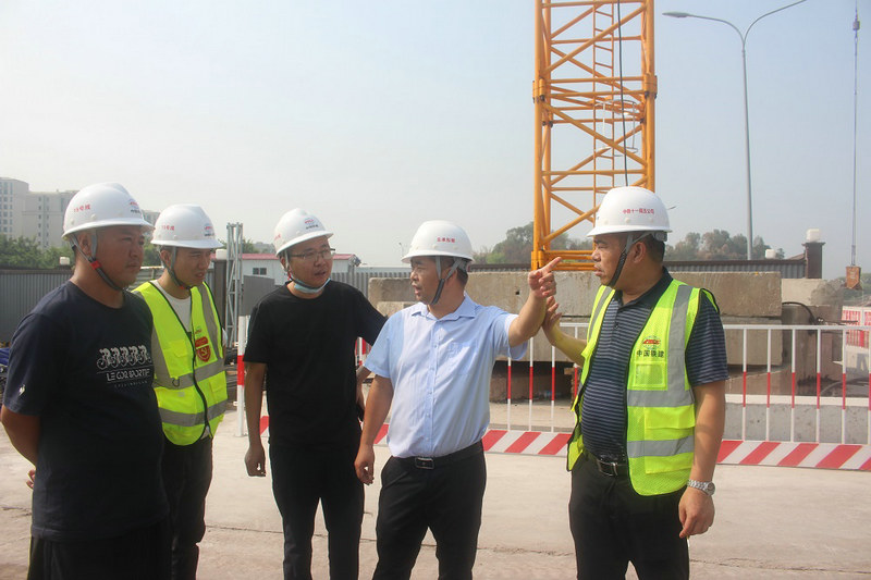 總承包部副指揮長兼總工程師楊振(右3)在16標(biāo)盾構(gòu)井始發(fā)現(xiàn)場巡查