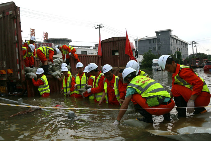 同時(shí),項(xiàng)目黨支部充分發(fā)揮戰(zhàn)斗堡壘作用,在鎮(zhèn)海、海曙區(qū)政府和駐地群眾需要時(shí),踐行央企責(zé)任。2021年7月“煙花”和9月“燦都”兩次臺(tái)風(fēng)途徑寧波,項(xiàng)目黨支部積極組織黨員提前做好預(yù)防,加固無(wú)法撤離的設(shè)備,轉(zhuǎn)移安置上千名員工。在臺(tái)風(fēng)來(lái)襲過(guò)程中和臺(tái)風(fēng)過(guò)后,由19名黨員帶頭、普通員工參加的搶險(xiǎn)突擊隊(duì),冒著狂風(fēng)暴雨奔赴石化區(qū)加固防洪堤壩,堆碼沙袋1公里,遏制了海水侵襲。當(dāng)古林鎮(zhèn)一片汪洋,10萬(wàn)名群眾生產(chǎn)、生活被洪水圍困之時(shí),該項(xiàng)目由黨員領(lǐng)銜的突擊隊(duì)出現(xiàn)在古林街頭,在齊腰深的洪水中用沙袋將涌水擋在高墻外,保護(hù)了群眾的生命安全,寧波市交通局、鎮(zhèn)海石化區(qū)管委會(huì)、古林鎮(zhèn)等多家政府部門(mén)送來(lái)錦旗和表?yè)P(yáng)信。