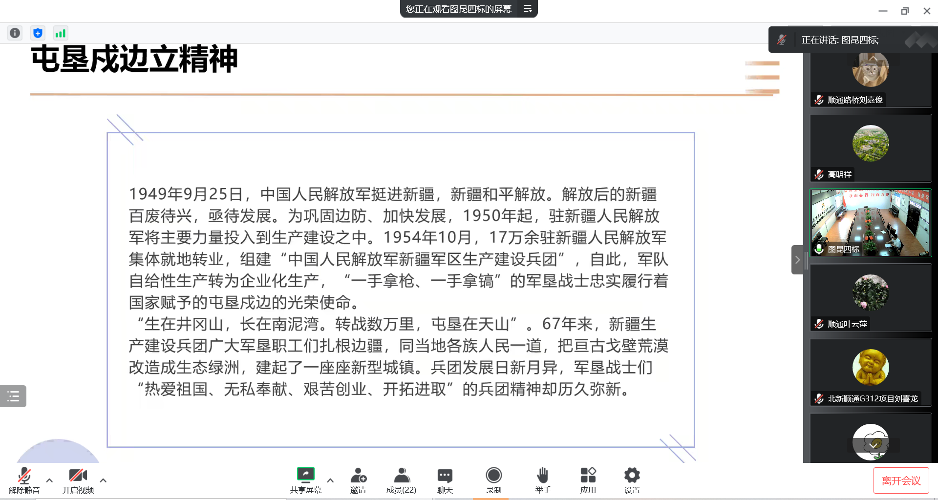兵團職工代表王維軍為大家講述了革命老兵們在屯墾戍邊的紅色故事和勵志精神,要學習他們胸懷全局、顧全大局的精神境界。“作為引領時代未來的主力軍,應當擁抱新時代,緬懷先輩付出。在深入基層中強歷練,在勇?lián)厝沃写僬衽d,讓兵團精神“活”起來;“走”出去!”