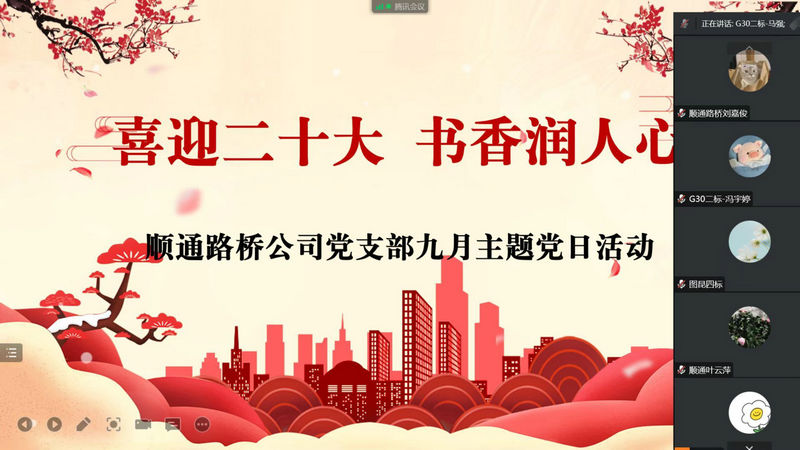 石河子訊(王鳳)順通路橋公司依托新時代文明實踐(站)和九月主題黨日內(nèi)容,在普天同慶的國慶來臨之際,通過線上分享的方式舉辦了“喜迎二十大 書香潤人心”讀書分享會活動,本次活動秉著黨建帶團建的新型模式,以“閱讀一本好書,進行一次分享,提升一層素養(yǎng),收獲一份快樂”為主線,暢談各位青年工作者的讀書心得,進一步激發(fā)廣大黨員干部、團員青年、群眾的愛黨愛國熱情,領悟黨的根本宗旨和初心使命,不斷從讀書學習成果中汲取新的智慧和力量。