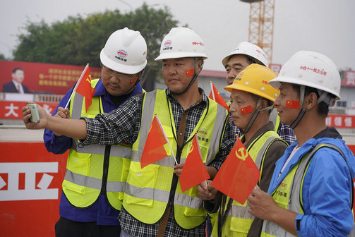 18標(biāo)項(xiàng)目部工人在工地收看黨的二十大開幕直播