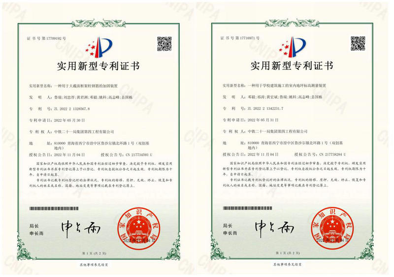近日,由中鐵二十一局四公司南川工業(yè)園區(qū)九年一貫制學(xué)校建設(shè)項(xiàng)目部申報(bào)的《一種用于大截面框架柱鋼筋的加固裝置》與《一種用于學(xué)校建筑施工的室內(nèi)地坪標(biāo)高測(cè)量裝置》兩項(xiàng)專利喜獲國(guó)家知識(shí)產(chǎn)權(quán)局頒發(fā)的實(shí)用新型專利證書,填補(bǔ)了項(xiàng)目部在專利成果方面的空白。