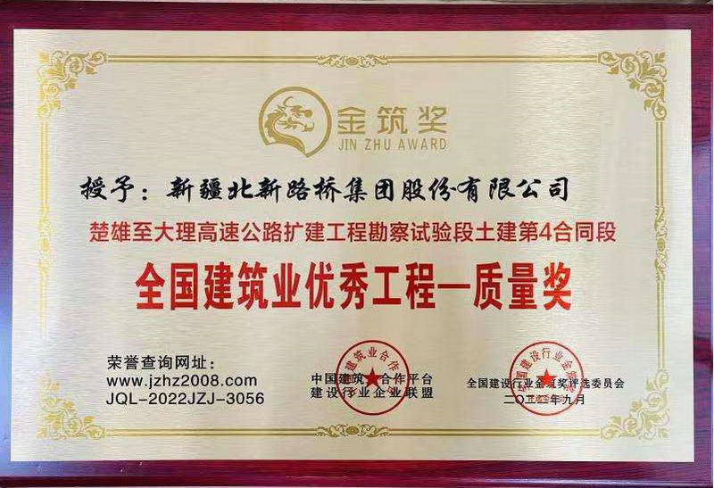 大理訊(通訊員 孫兆艷 劉繼紅)近日,由兵團交通建設有限公司承建的云南楚雄至大理高速公路改擴建工程勘察試驗段土建第四合同段工程(以下簡稱云南楚大項目)榮獲“全國建筑行業(yè)優(yōu)秀工程-質(zhì)量獎”。