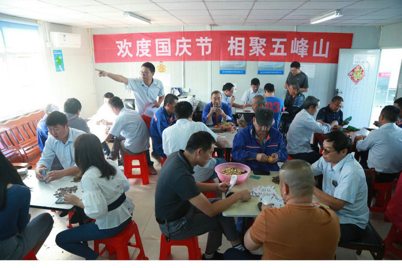 10月1日早,最令職工們喜聞樂見的“摜蛋”活動拉開帷幕,有“固定搭檔”早已虛席以待,“夫妻搭檔”的牌桌上一片歡聲笑語,綜合辦公室人員端上了花生、瓜子,備好了冬棗、金橘,掛上了“歡度國慶節(jié),相聚五峰山”的條幅,營造出職工與家屬齊聚一堂,共享闔家歡樂的氛圍。激烈的“摜蛋”比賽一直持續(xù)到晚上,在廝殺到第五輪之后終于決出了冠亞軍。