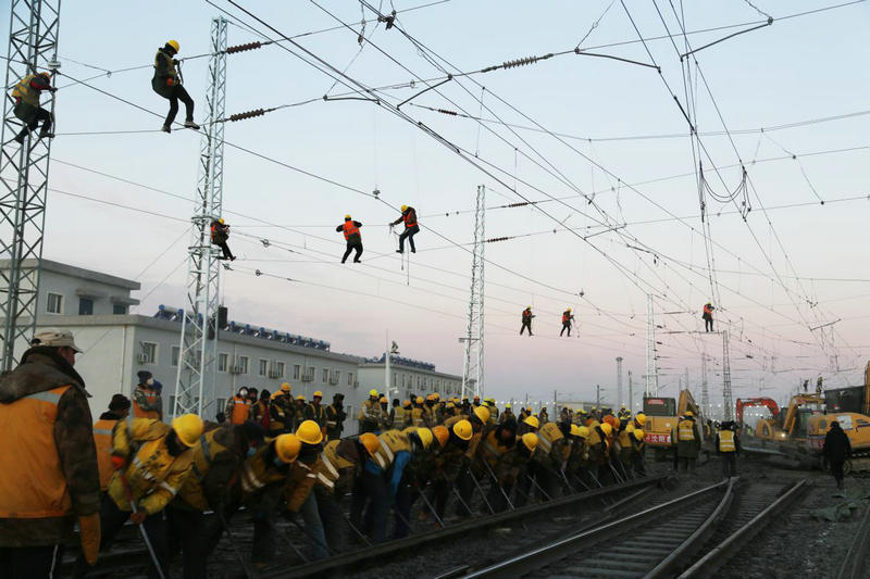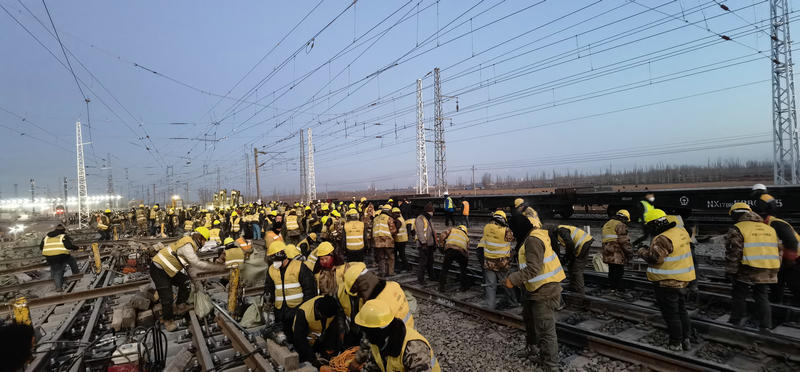 12月27日,400余名工人冒著零下17度的嚴(yán)寒經(jīng)過(guò)連續(xù)8.5小時(shí)的鐵路二級(jí)封鎖施工,成功拆除既有道岔6組,線(xiàn)路59.43米,插入道岔5組,補(bǔ)充軌排46.16米,同步哈密東Ⅱ場(chǎng)(駝峰尾部)、Ⅲ場(chǎng)(上行出發(fā)場(chǎng))新增信號(hào)設(shè)備安裝調(diào)試,室內(nèi)外配線(xiàn)拆改,新聯(lián)鎖、CTC軟件更換及聯(lián)鎖試驗(yàn),軋道試驗(yàn)、改方、場(chǎng)聯(lián)試驗(yàn);調(diào)度所局中心服務(wù)器數(shù)據(jù)修改,完成哈密東Ⅲ場(chǎng)接觸網(wǎng)接觸懸掛撥移、過(guò)渡、調(diào)整,哈密東Ⅱ、Ⅲ場(chǎng)聯(lián)絡(luò)線(xiàn)Ⅱ-2#與Ⅱ-3#支柱間接觸網(wǎng)線(xiàn)索對(duì)接、分段絕緣器安裝及調(diào)試,隔開(kāi)引線(xiàn)安裝及調(diào)整,接觸網(wǎng)熱滑試驗(yàn)。標(biāo)志著由中鐵二十一局集團(tuán)承擔(dān)施工的哈密東站擴(kuò)能改造工程順利完成。