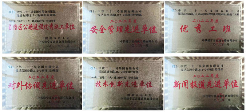 中鐵二十一局銀昆高速公路LJ12-2標項目經(jīng)理部在銀昆高速公路眾多標段中脫穎而出,獲得自治區(qū)公路建設(shè)優(yōu)秀施工單位、安全管理先進單位、技術(shù)創(chuàng)新先進單位、新聞報道先進單位、對外協(xié)調(diào)先進單位、任灣茹河優(yōu)秀工班等6項先進集體榮譽及自治區(qū)公路建設(shè)先進個人、優(yōu)秀項目黨支部書記、先進工作者、優(yōu)秀項目安全總監(jiān)、安全生產(chǎn)先進個人、技術(shù)創(chuàng)新先進個人等8人次個人榮譽。此外,該項目任灣茹河特大橋還被股份公司評為2022年度安全標準工地。