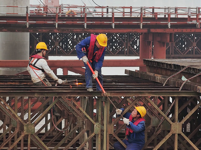 元宵節(jié)前后這段時(shí)間,杭州灣地區(qū)與往年相比,雨水激增,杭甬復(fù)線互通位于鎮(zhèn)海區(qū)海域,連綿不絕的雨水給運(yùn)梁、架梁、拆除棧橋和橋面混凝土施工帶來一定困難。雨水天一個(gè)突出特點(diǎn)是,氣溫低、濕滑,有雨必有風(fēng),可謂風(fēng)雨交加?;颐擅傻臍饬骰\罩著氣勢恢宏的濱海互通,動(dòng)蕩不安的海水越發(fā)不安分。置身于棧橋上、高空橋梁上的員工們經(jīng)受著雨水的“沐浴”,冷得渾身發(fā)抖,可是不到下班時(shí)間不能隨便離開。穿上雨衣干活,顯得笨手笨腳,而雨衣常常在施工過程中不小心被釘子、鋼筋劃破,哪個(gè)員工的雨衣都有幾個(gè)口子,雨水會(huì)順著不起眼的裂口流進(jìn)里面的衣服上。這還不算啥,濕漉漉的天氣潛伏著安全隱患才值得警惕。由于腳下的地面都是水,容易滑倒摔傷。但不能因?yàn)橄掠甓9?,除非遇到大雨或暴雨?級以上大風(fēng),才撤離現(xiàn)場。一般小雨和6級以下風(fēng)力,都要照常施工。季節(jié)性的變化是自然規(guī)律,誰也阻止不了雨水的降臨。為了員工的安全,項(xiàng)目部按照雨天安全管理辦法,由現(xiàn)場負(fù)責(zé)人、安全總監(jiān)、專職安全員每天在工地巡檢,在排除安全隱患的同時(shí),最有效的辦法便是大聲提醒作業(yè)員工,上班要穿防滑鞋,走路要小心,臨水和高空作業(yè)要系好保險(xiǎn)繩,不能嫌麻煩、圖省事,要在保證個(gè)人的生命安全的前提下進(jìn)行施工。濱?;ネㄊ墙衲晟习肽旯?jiān)的重中之重,計(jì)劃生產(chǎn)鋼箱梁232片、疊合梁90片,現(xiàn)澆橋面板41聯(lián),安裝防撞欄14472米,完成鋼箱梁架設(shè)142片、疊合梁90片。任務(wù)都分解到各施工隊(duì),規(guī)定了完成任務(wù)的節(jié)點(diǎn),從項(xiàng)目部到施工隊(duì)員工,以不畏難、不怕苦、勇?lián)?dāng)、只爭朝夕的拼搏精神投入到工作中。兩個(gè)棧橋隊(duì)以每天拆除30多平米棧橋的速度向前推進(jìn)。舟山梁場晝夜不停地生產(chǎn)加工鋼箱梁、疊合梁。橋面施工隊(duì)組織機(jī)械和人力緊鑼密鼓地鋪設(shè)鋼筋網(wǎng)、澆筑混凝土。卸梁站、提梁站以及運(yùn)梁車和兩臺(tái)架橋機(jī)的操控人員,在現(xiàn)場管理人員指導(dǎo)下緊張有序地進(jìn)行作業(yè)。