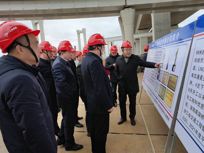 下午4點(diǎn)10分,王立軍帶領(lǐng)縣委常委、政法委書記于師義,縣委常委、辦公室主任張鵬,以及下屬部分局、鎮(zhèn)主管和企業(yè)家等20余人來到杭甬項(xiàng)目濱?;ネ?,首先聽取了常務(wù)副經(jīng)理喬繼保關(guān)于杭甬項(xiàng)目工程概況、安全質(zhì)量、隊(duì)伍管理、施工進(jìn)展等情況介紹。公司副總經(jīng)理兼杭甬項(xiàng)目負(fù)責(zé)人黃偉就項(xiàng)目的科技含量、科技攻關(guān)、安全跨越海底17條管線等作了補(bǔ)充,并介紹了公司近幾年生產(chǎn)經(jīng)營、實(shí)施人才戰(zhàn)略、隊(duì)伍結(jié)構(gòu)、發(fā)展前景等。隨后,王立軍等饒有興趣地觀摩了主線橋和G、E、F匝道橋高空架梁施工過程及工程質(zhì)量、安全防護(hù)等情況,并觀賞了由企業(yè)簡介和多幅濱海互通、濱海高架施工圖片組成的6塊展板。許多人舉起手機(jī)對準(zhǔn)橋墩或者橋梁拍照。王立軍說:“這次到中鐵十五局杭甬項(xiàng)目參觀學(xué)習(xí),耳聞不如一見。十五局名不虛傳,有很強(qiáng)的實(shí)力,這么大的海上項(xiàng)目,從橋墩到橋梁,施工質(zhì)量稱得上是精品,我要把你們的經(jīng)驗(yàn)帶回去,組織有關(guān)人員進(jìn)行研討。希望十五局參與寧陽公路、生態(tài)等領(lǐng)域的投資、建設(shè)和合作運(yùn)營。