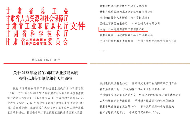 近日,從甘肅省總工會(huì)獲悉,中鐵二十一局四公司在甘肅省2022年百萬(wàn)職工職業(yè)技能素質(zhì)提升活動(dòng)中被評(píng)為優(yōu)秀組織單位。