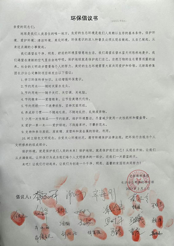 3月1日,北新路橋集團(tuán)長(zhǎng)沙分公司舞陽片區(qū)項(xiàng)目在項(xiàng)目駐地旁開展志愿植樹活動(dòng),志愿者們分工協(xié)作、相互配合,挖穴扶苗、夯土澆水,每個(gè)步驟循序漸進(jìn),每道工序都做得認(rèn)真仔細(xì)。此次活動(dòng)不僅種下一片愛心,也為當(dāng)?shù)卦鎏砹艘环莪h(huán)保綠,活動(dòng)結(jié)束后,該項(xiàng)目全體職工簽定了環(huán)保倡議。