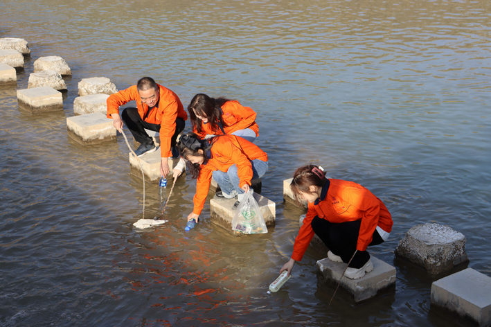 清理河道白色污染物(何璐彤 攝)