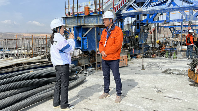 記者首先采訪了項(xiàng)目經(jīng)理,詢問并了解了任灣茹河特大橋的施工進(jìn)度情況、施工難點(diǎn)以及選線意義。隨后,記者在項(xiàng)目經(jīng)理的陪同下來到特大橋的11#墩頂,項(xiàng)目經(jīng)理向記者詳細(xì)地介紹了更多有關(guān)任灣茹河特大橋的管理、日常作業(yè)、施工安全等信息,通過直播讓更多人了解到銀昆LJ12-2標(biāo)的重點(diǎn)工程建設(shè)情況。在到達(dá)墩頂后,記者采訪了技術(shù)員張治飛,了解了技術(shù)員的日常工作和目前正在攻堅(jiān)的掛籃施工難點(diǎn)等情況。張治飛為記者介紹并演示了項(xiàng)目部組織研發(fā)的一種新套組,針對現(xiàn)場問題,這種新套組能夠極大地節(jié)本增效,而且申請了專利,之后能在更多標(biāo)段推廣運(yùn)用。張治飛自豪地表示,自己身為彭陽本地人,非常期待銀昆高速的建成通車,可以將自己家鄉(xiāng)的美食特產(chǎn)帶到更多的地方,讓更多人了解彭陽、禮贊彭陽。