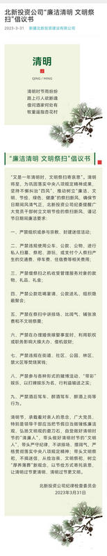 北新投資公司紀委發(fā)出“廉潔清明 文明祭掃”倡議書