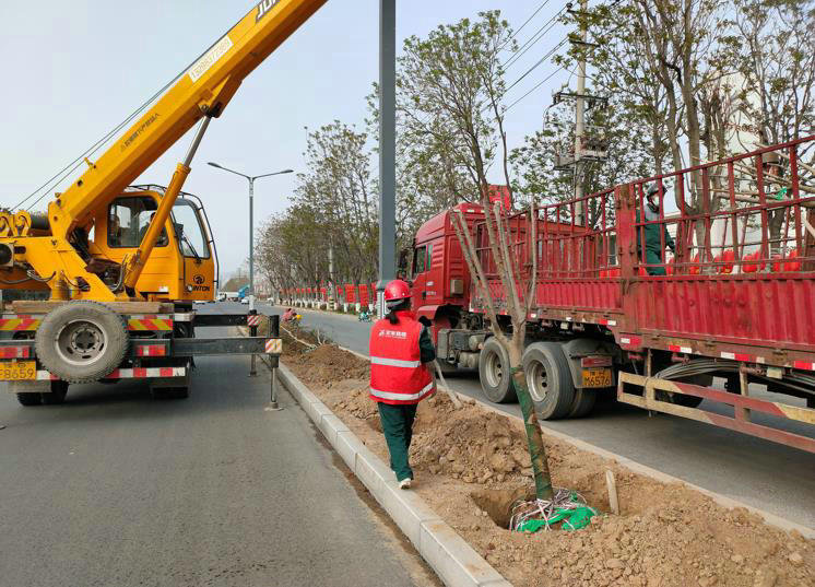 據(jù)悉,該項目濟源市黃河大道、濟源大道等主干要道的綠化施工進展迅速,駕車或步行途中,已經可以看到包括重陽木、日本晚櫻、桂花、樹狀月季等在內的多種造型樹木挺立兩旁,并搭配了海桐球、紅葉石楠等各類觀賞性灌木,預計苗木成活成蔭后,將會極大的提升濟源市容市貌、改善周邊整體人居環(huán)境。為保障施工節(jié)點盡早達成,該項目部統(tǒng)籌調度人力機械,加強了對現(xiàn)場的組織協(xié)調,遵循“美化、安全兩不誤”的綠化理念,工人們嚴格按照指揮緊張有序的開展株距測量、挖掘、移栽、保護支撐及澆灌作業(yè),各道工序穿插高效、井井有條。