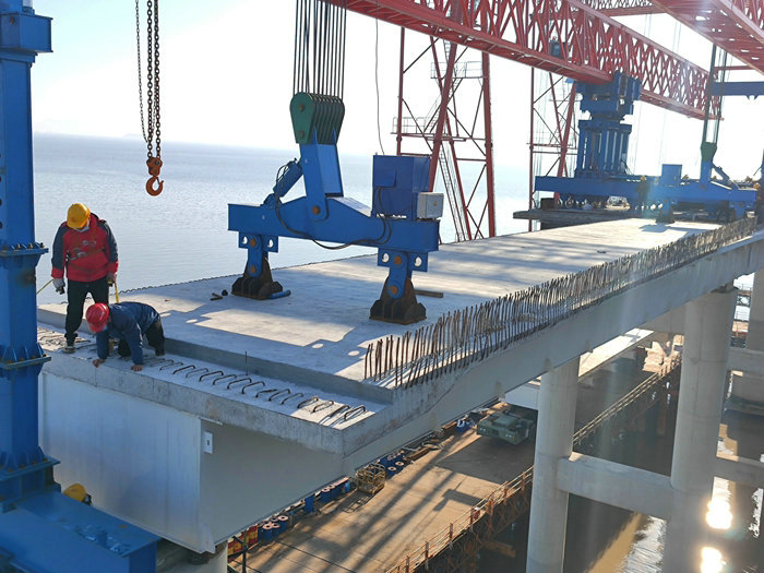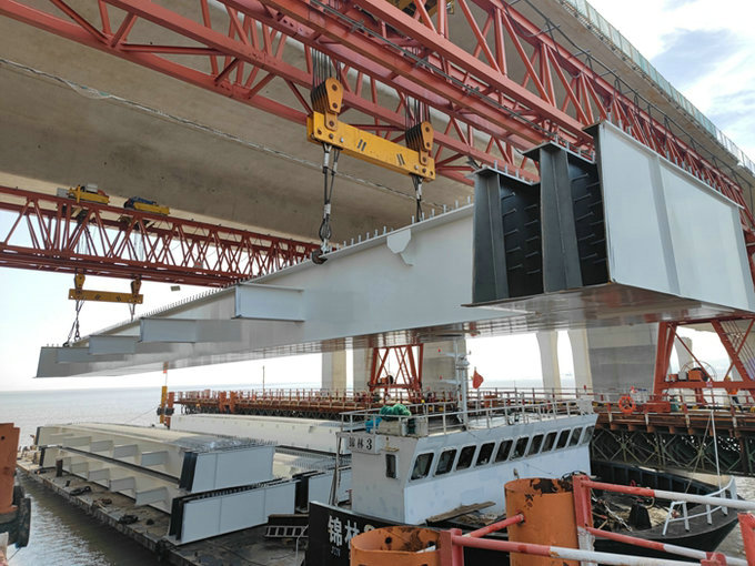 目前G、E兩條匝道安全架通,本月下旬有一條匝道將上跨金塘大橋,標志著第3條匝道完成架梁任務(wù)。