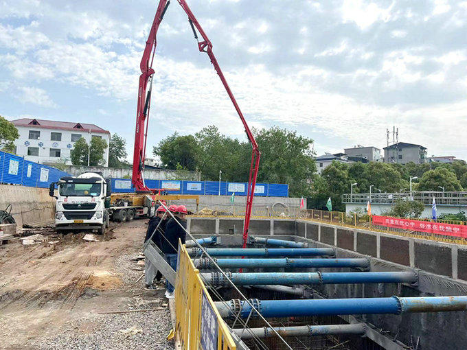污水處理廠擴(kuò)容工程占地面積0.35公頃,擴(kuò)建規(guī)模1萬(wàn)m/d,是廬山城鄉(xiāng)污水治理工程重難點(diǎn)工程。工藝流程為:預(yù)處理+BFM工藝+連續(xù)砂濾池,出水水質(zhì)一級(jí)A排放標(biāo)準(zhǔn)。包含結(jié)構(gòu)、建筑、設(shè)備、電氣、自控、暖通等專業(yè);新建的構(gòu)(建)筑物有:細(xì)格柵及旋流沉沙池、BFM-B池、BFM-M池、鼓風(fēng)機(jī)房、生物除臭裝置、流量計(jì)井等。此次澆筑的是該構(gòu)筑物BFM-B池底板,基坑尺寸為26.7*13.7*9.45m,地下9.45m;約300立方混凝土。為順利完成澆筑任務(wù),施工前期項(xiàng)目部制訂了切實(shí)可行的施工方案,并對(duì)作業(yè)人員進(jìn)行詳細(xì)的技術(shù)、安全交底,精心組織,工序銜接緊密,嚴(yán)格按照施工規(guī)范和操作規(guī)程進(jìn)行,為7月底完成節(jié)點(diǎn)目標(biāo)奠定了基礎(chǔ)。