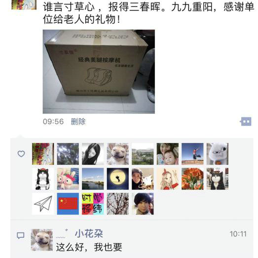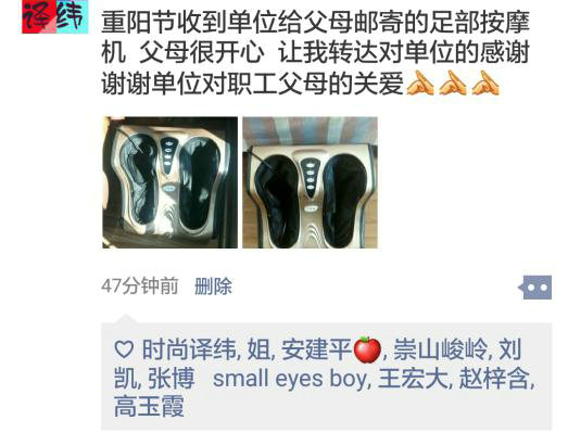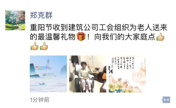 10月17日是今年的重陽節(jié)。中鐵建大橋局集團建筑公司職工都在朋友圈內(nèi)曬起了送給父母的祝福。這次不僅僅是簡單的祝福語,更是有了一個“新物件”,那就是公司為職工70歲以上父母精心準備的按摩儀。