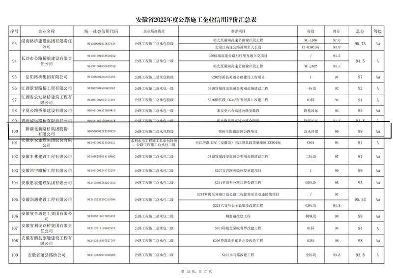 從安徽省交通運(yùn)輸廳網(wǎng)站獲悉,北新路橋集團(tuán)憑借良好的企業(yè)形象獲評(píng)2022年度安徽省公路施工和設(shè)計(jì)企業(yè)信用評(píng)價(jià) A A級(jí),這是該集團(tuán)自進(jìn)入安徽市場(chǎng)以來首次獲此殊榮。