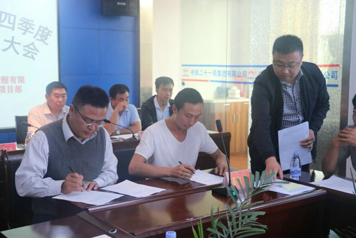 根據(jù)會議議程,項目經(jīng)理洪富義分別與各勞務(wù)隊負(fù)責(zé)人簽訂了大干目標(biāo)責(zé)任狀,項目書記陳建良作了動員講話。洪富義對開展勞動競賽活動作了部署安排,要求全體參建人員要以強烈的緊迫感、危機感和責(zé)任感,攻堅克難,齊心協(xié)力,在保證安全質(zhì)量的前提下,全面掀起大干熱潮,為完成產(chǎn)值和各項節(jié)點目標(biāo)共同努力。