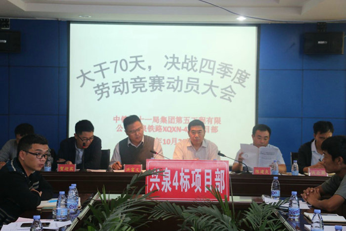 凝心聚力,堅定信心。10月20日下午,中鐵二十一局集團五公司興泉鐵路四標(biāo)項目部召開“大干70天 決戰(zhàn)四季度”勞動競賽動員會。局指揮部黨工委書記高湛齊、分部班子成員、各部室、各架子隊、拌合站及各勞務(wù)隊負(fù)責(zé)人共計70余人參加。