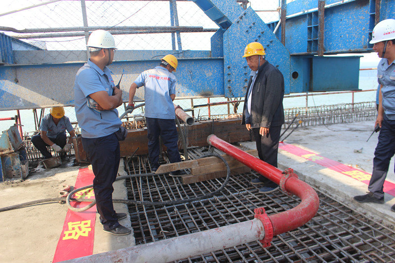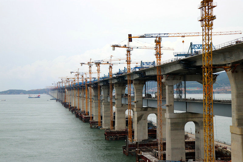 福平鐵路平潭海峽公鐵兩用大橋,大橋全長(zhǎng)16.3km,是世界上最長(zhǎng)、最大跨度的跨海峽公鐵兩用大橋。采用雙層橋面,上層是六車道時(shí)速100公里高速公路,下層是可供動(dòng)車組列車行駛的速200公里的雙線I級(jí)鐵路,它是中國(guó)第一座真正意義上的公鐵兩用跨海大橋。中鐵建大橋局一公司承建平潭海峽公鐵兩用大橋(B39~B58)跨越北東口水道,全長(zhǎng)1436m。鐵路主橋92+2×168+92m預(yù)應(yīng)力混凝土連續(xù)剛構(gòu),引橋64m、40m簡(jiǎn)支箱梁。公路主橋92+2×168+92m預(yù)應(yīng)力混凝土連續(xù)剛構(gòu),引橋左右幅各5聯(lián)連續(xù)箱梁,孔跨與鐵路簡(jiǎn)支梁跨度相對(duì)應(yīng)。該橋于2013年11月開工建設(shè),經(jīng)過“鐵軍”中鐵建大橋局?jǐn)?shù)千名建設(shè)者近5年的艱辛努力,目前主橋鐵路梁已順利合攏,這是“基建狂魔”在建橋禁區(qū)內(nèi)取得又一次大捷,橋梁猶如巨龍般橫亙于碧波蕩漾大平潭海峽之上。