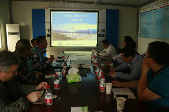 上午9時許,調(diào)研人員到達鵝公巖軌道專用橋施工現(xiàn)場,首先由項目經(jīng)理高學文針對工程概況、施工重難點以及現(xiàn)場施工進度作了簡要介紹。參觀結(jié)束后,調(diào)研人員在會議室觀看了施工動漫并聽取了工程資料(檔案)電子化工作情況匯報。匯報共分為五部分,重點介紹了聲像檔案以及電子文件生成過程:聲像檔案共分為三個步驟,分別是現(xiàn)場拍攝、整理歸納、移交檔案;電子文件共分為四項,分別是表格選用、填寫工程用表、簽字確認以及移交檔案。