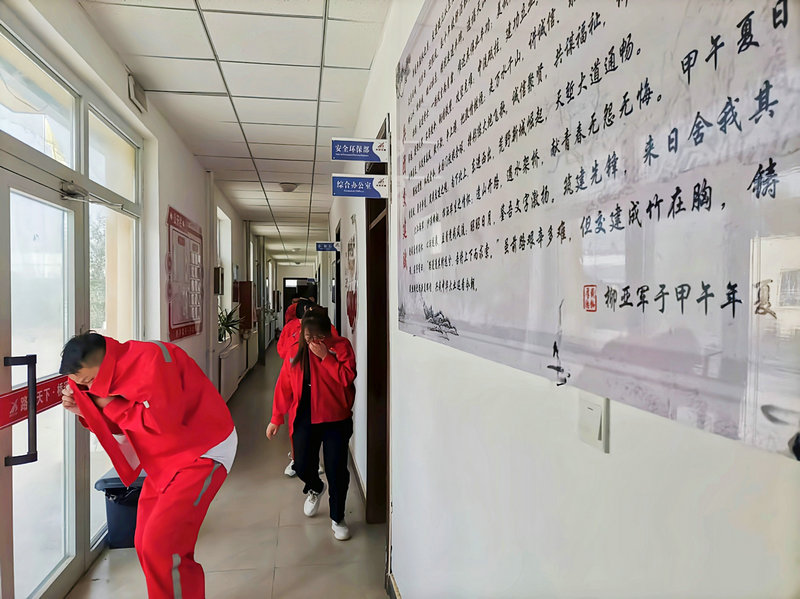 演練現(xiàn)場模擬辦公樓發(fā)生火情,辦公室人員發(fā)現(xiàn)火情時,通過無線對講系統(tǒng)通知安全員及項目負責人迅速啟動消防應急預案。“請大家不要驚慌,保持鎮(zhèn)定,身體放低、捂住口鼻、有序疏散”。疏散組在出口處指引和疏散非救援人員,指引大家從指定的安全出口進行逃生。滅火組及時趕到現(xiàn)場,用干粉滅火器對起火點持續(xù)性滅火,充分發(fā)揮“打早滅小”、撲救初期火災的作用。