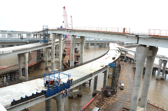 濱?;ネㄈL(zhǎng)9705米,由1座主線、4座拼寬和8座匝道橋組成,呈苜蓿葉狀,設(shè)計(jì)470片鋼混疊合梁,3條匝道上跨甬舟高速金塘大橋,4條匝道與金堂大橋東西兩側(cè)相交,是亞洲最大的海上互通。其中B匝道全長(zhǎng)786.068米,鋼混疊合梁60片、30米長(zhǎng),梁面寬,且為曲線,最大縱坡3.7%、橫坡3%,架橋機(jī)過孔時(shí),支腿調(diào)整難度大,運(yùn)梁車橫坡調(diào)整功能和轉(zhuǎn)向功能必須正常,由于是偏載運(yùn)梁,曲線喂梁,運(yùn)梁過程中必須處于平穩(wěn)狀態(tài),避免傾覆。海上高空架梁安全風(fēng)險(xiǎn)高,不易察覺的隱患多。針對(duì)這一現(xiàn)象,他們從卸梁站、提梁站再到履帶吊起吊、運(yùn)梁車運(yùn)梁、喂梁、架設(shè)、安放等每個(gè)環(huán)節(jié),保持高度的安全警惕性,4名副經(jīng)理,以及安全總監(jiān)、安全部長(zhǎng)等現(xiàn)場(chǎng)管理人員,不放過任何蛛絲馬跡,上午和下午架梁前都要仔細(xì)排查一遍,是否存在不安全苗頭,鋼絲繩、滑輪、吊鉤有無破損、老化、卡簧失靈等細(xì)微變化,機(jī)械設(shè)備完全達(dá)到最佳狀態(tài),才準(zhǔn)許作業(yè)。公司副總經(jīng)理兼杭甬項(xiàng)目黨支部書記、項(xiàng)目負(fù)責(zé)人黃偉,三天兩頭深入濱海互通架梁現(xiàn)場(chǎng)指導(dǎo)施工,就地解決難題,保證卸梁、提梁、運(yùn)梁、架梁等每一道工序不出任何紕漏。