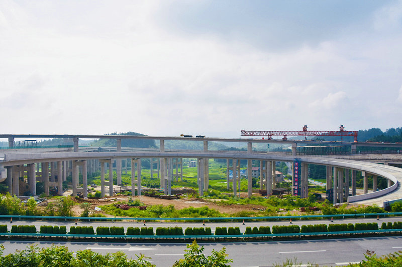 為確保節(jié)點目標(biāo)的順利完成,該項目團(tuán)隊以“平安工地”“品質(zhì)工程”為抓手,精心部署,攻堅克難。一方面克服山區(qū)地形高差大、橋梁高度高、施工場地狹窄等困難,在現(xiàn)澆箱梁施工中,采用梁柱式鋼管貝雷梁支架施工。克服陰雨,搶抓晴天,在全線率先完成首聯(lián)現(xiàn)澆箱梁澆筑。另一方面,考慮該匝道橋曲線半徑較小,為了避免對既有高速公路造成交通影響,經(jīng)充分調(diào)研和論證后,采用架橋機(jī)分片架設(shè)再組焊施工,縮短作業(yè)時間。同時,在既有線交叉施工中,他們提前謀劃,多次與高速交警及運(yùn)營單位對接協(xié)商,完善交通組織方案。項目“黨員突擊隊”“青年突擊隊”積極協(xié)助臨時交通管制。除此,他們還對高處作業(yè)、臨邊防護(hù)等高風(fēng)險工序加強(qiáng)全程盯控,在作業(yè)區(qū)防護(hù)棚和架橋機(jī)上均安裝了監(jiān)控設(shè)備,第一時間獲取現(xiàn)場動態(tài),確保了施工安全、質(zhì)量和進(jìn)度有序推進(jìn)。