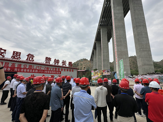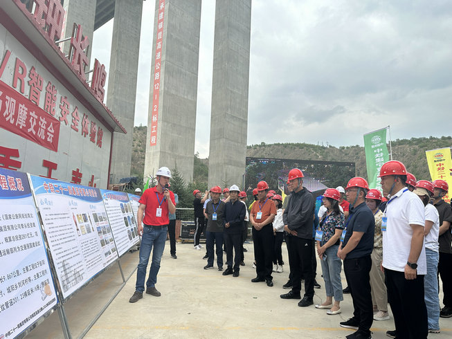 在觀摩現(xiàn)場(chǎng),項(xiàng)目總工程師為大家介紹了公司簡(jiǎn)介、項(xiàng)目工程概況,觀摩團(tuán)了解了任灣茹河特大橋牛腿支架的創(chuàng)新過(guò)程、高墩養(yǎng)生自動(dòng)噴淋系統(tǒng)、液壓爬模系統(tǒng)、大體積溫控承臺(tái)等一系列新技術(shù)微創(chuàng)新,紛紛贊揚(yáng)了項(xiàng)目部積極響應(yīng)中鐵建寧夏高速公路有限公司“微改革、微創(chuàng)新”活動(dòng),推動(dòng)“微創(chuàng)新”技術(shù)、工法、設(shè)備、工藝的實(shí)踐運(yùn)用。隨后,大家移步到技術(shù)賦能視頻區(qū),仔細(xì)且直觀地通過(guò)動(dòng)畫的形式了解了任灣茹河特大橋從地基到橋墩再到橋面的建造思路和模型,大家紛紛感嘆其結(jié)構(gòu)之精巧,創(chuàng)新之實(shí)用,并對(duì)其給出了高度贊揚(yáng)。