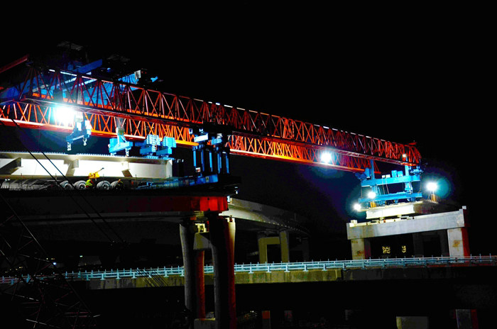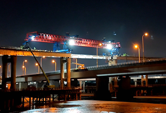 在現(xiàn)場(chǎng)指揮人員指揮下,兩臺(tái)架橋機(jī)分別在A、D匝道上同時(shí)架梁,經(jīng)過(guò)4個(gè)多小時(shí)的操作,先后完成13道工序操作流程,將4片40米長(zhǎng)的疊合梁一次性安全架設(shè)到位,成功上跨金塘大橋。