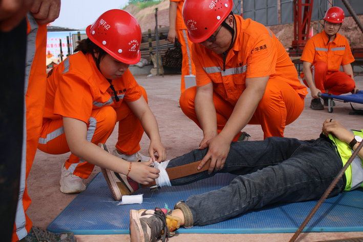 此演練模擬預制梁場鋼筋加工廠龍門吊在起重吊裝過程中,重物掉落傾覆砸傷一名作業(yè)人員。事故發(fā)生后,現(xiàn)場技術人員立即上報到指揮長,指揮長立即下達命令,迅速組織技術保障組、治安保衛(wèi)組、搶險救援組、醫(yī)療救護組、物資保障組各小組出動,以最快速度將傷員救援送往醫(yī)院救治。整個演練活動從接警、報警到應急響應、搶險救援、善后處置,各小組配合默契,順利完成演習,救援過程符合預案要求,現(xiàn)場秩序良好,達到了預期效果。