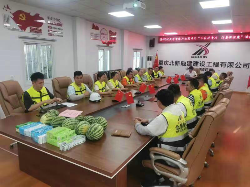 為上海國科G60數(shù)字智能產業(yè)園項目員工送上解暑水果飲品及藥品,召開座談會,了解職工思想狀況,叮囑職工們提高安全健康意識,合理調整工作時間,注意休息,防止中暑。(武楷文攝)
