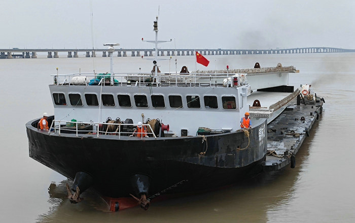 濱海互通所需鋼混疊合梁在舟山制造,因超長超寬、安全隱患多、從甬舟高速只運輸一車6片梁便叫停,改由船舶運輸至濱海互通施工現(xiàn)場。為保證運梁通航安全,寧波海事局專門派人勘察線路,進一步縮短運梁距離。在鋼混疊合梁運輸過程中,海事局及時發(fā)布海況、天氣等信息,運梁避開大風大浪天氣,為海運安全上了一道安全屏障。截止7月23日,經(jīng)海上運輸?shù)?3船、464片鋼混疊合梁全部由舟山安全抵達濱?;ネ?,7月25日將完成濱?;ネㄗ詈笠黄旱募茉O(shè)。
