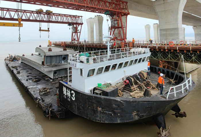 鐵路工程建設(shè)網(wǎng)訊(通訊員彭勇 呂奎元)7月23日下午,隨著寧波海事局護航的一艘裝載著30米長、3片170噸鋼混疊合梁的貨船駛進杭甬復線寧波一期濱?;ネǜ鄢?,從海上運輸?shù)?64片梁全部完成。