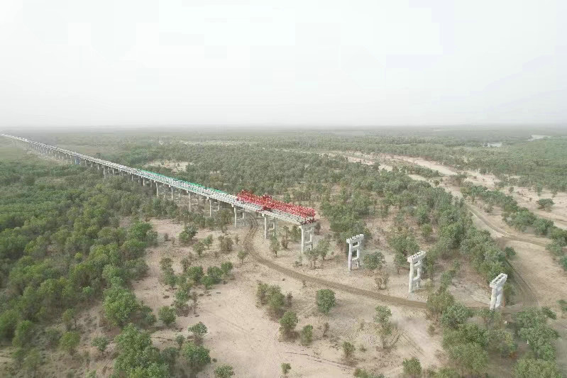 目前,葉爾羌河特大橋下部結(jié)構(gòu)已全部完成,30預制箱梁架設(shè)306榀,橋面連接24聯(lián),現(xiàn)場正抓緊梁板架設(shè)和防撞護欄澆筑施工中,計劃將于8月上旬完成全部梁板架設(shè)。