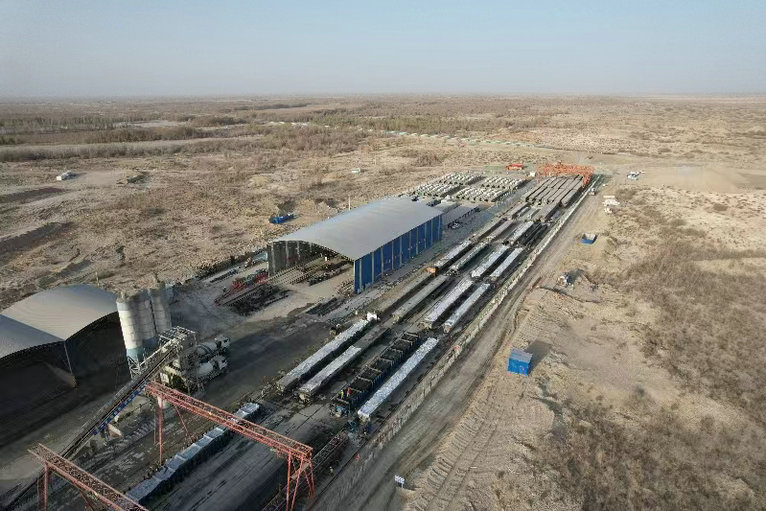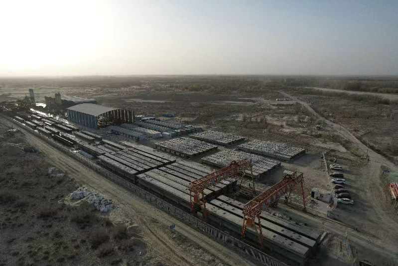 該綜合場(chǎng)站位于圖昆二標(biāo)項(xiàng)目線路起點(diǎn)右側(cè)約150m處空地上,占地面積共37000㎡,綜合場(chǎng)站主要包含梁板預(yù)制區(qū)、鋼筋加工場(chǎng)、混凝土拌合站、工地試驗(yàn)室,另外還配置辦公區(qū)、生活區(qū),主要承擔(dān)著葉爾羌河特大橋384榀箱梁的預(yù)制及架設(shè)任務(wù)。