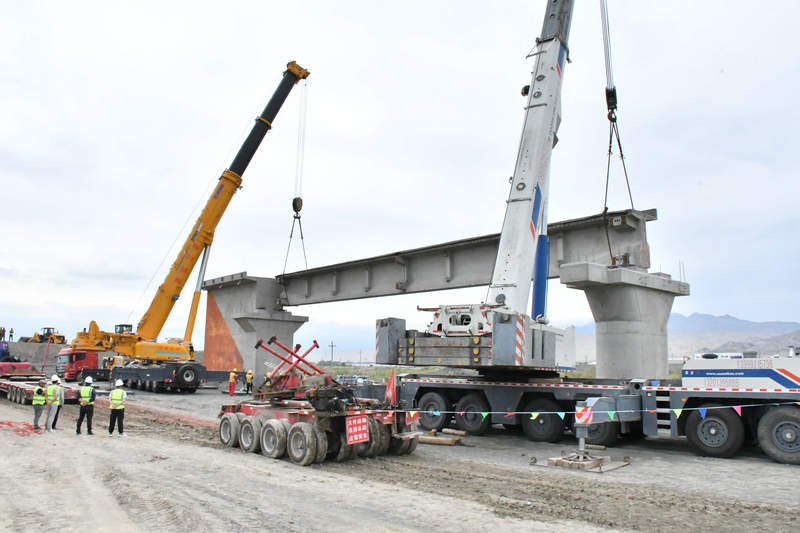 8月14日,在中鐵二十一局集團(tuán)有限公司承建的蘭新鐵路精河至阿拉山口段增建二線S2標(biāo)項(xiàng)目施工現(xiàn)場(chǎng),經(jīng)過1個(gè)小時(shí)的吊裝作業(yè),石油管線中橋首孔T梁架設(shè)成功。
