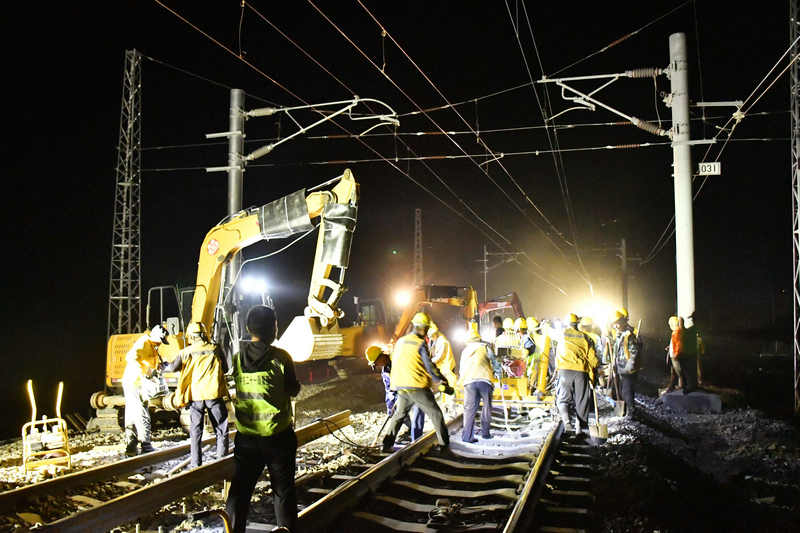 1時(shí)10分,隨著現(xiàn)場(chǎng)施工命令下達(dá),作業(yè)人員迅速?gòu)陌踩渚€外有序進(jìn)入封鎖施工區(qū),與大型機(jī)械設(shè)備密切配合,有條不紊地開(kāi)始作業(yè),攏口便線撥接,斷軌、清砟、撥接、搗固等作業(yè)過(guò)程順次推進(jìn)。通過(guò)180分鐘連續(xù)奮戰(zhàn),圓滿完成了便線撥接的施工任務(wù)。