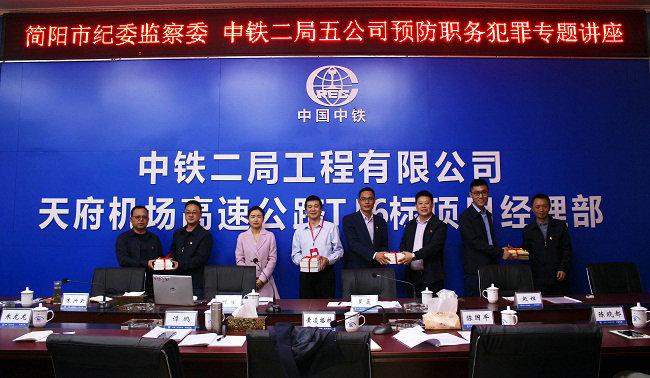 講座結(jié)束后,葉佳和中鐵二局五公司黨委副書記、紀(jì)委書記羅聶為項目員工代表贈送廉潔書籍。羅聶表示,項目將以本次講座為契機,將防范廉潔風(fēng)險要求嵌入工程管理的每個關(guān)鍵崗位和關(guān)鍵環(huán)節(jié),領(lǐng)導(dǎo)干部要帶頭遵紀(jì)守法,為員工群眾做出表率,打造讓簡陽市人民放心的優(yōu)質(zhì)工程。