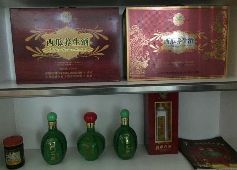 記者同田金相來到了他在“中牟縣西瓜協(xié)會”和“中牟縣農(nóng)田西瓜蔬菜研究所”的辦公室,看到辦公桌上擺滿了標(biāo)有不同配方的各種西瓜酒樣品。田金相告訴記者,西瓜酒是以西瓜汁為主料,輔以糯米、小麥、雪蓮、黨參、蜂蜜等釀造而成,酒精度數(shù)從10度到50度不等。
