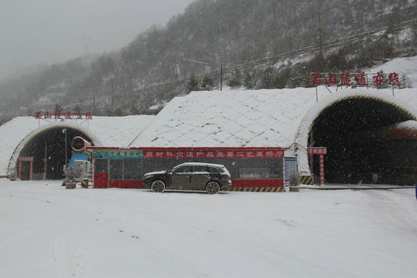 白雪皚皚的關山隧道進口??????? 關山隧道進口端左線與斜井的順利貫通,標志著平天高速公路控制性工程關山特長隧道建設取得了重要的階段性成果,為全線按期順利竣工奠定了堅實基礎。