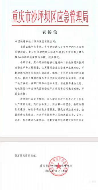 冬寒信暖,備受鼓舞。元旦前夕,中國(guó)鐵建重慶軌道交通15號(hào)線(xiàn)二期總承包部16標(biāo)14局項(xiàng)目部收到重慶市沙坪壩區(qū)軌道交通辦公室、重慶市沙坪壩區(qū)應(yīng)急管理局、重慶市北碚區(qū)住房和城鄉(xiāng)建設(shè)委員會(huì)等發(fā)來(lái)的感謝信,信中對(duì)項(xiàng)目部恪盡職守精準(zhǔn)履約,施工工序注重水保環(huán)保“綠色施工”常態(tài)化,無(wú)煙塵、無(wú)噪音工地和棄土外運(yùn)不擾民給予了高度贊揚(yáng),肯定了項(xiàng)目部在施工過(guò)程中展現(xiàn)出披荊斬棘的奮發(fā)姿態(tài),孜孜不倦的創(chuàng)新精神。