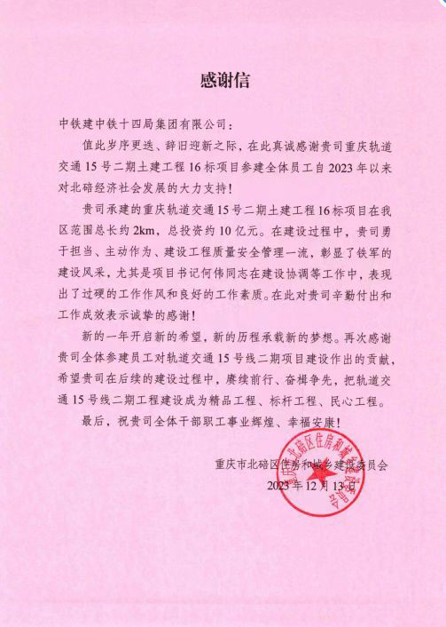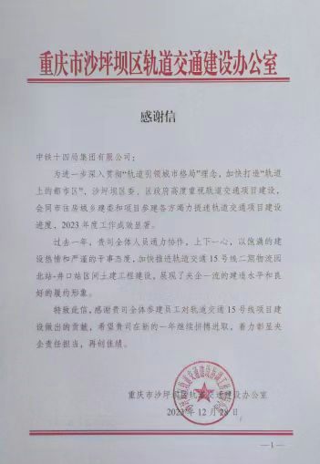 ------重慶軌道交通15號(hào)線(xiàn)二期16標(biāo)項(xiàng)目部收到地方四封感謝信