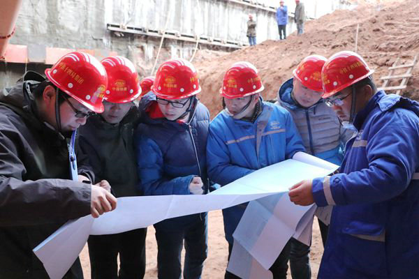 驗(yàn)收人員在施工現(xiàn)場(chǎng)認(rèn)真查看圖紙