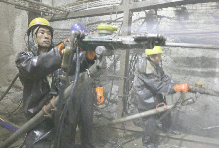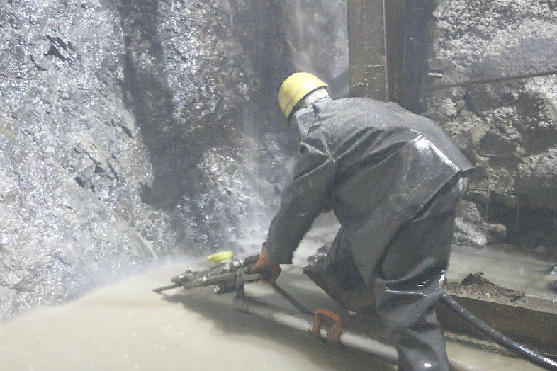 員工們?cè)谟克畤?yán)重的隧道掌子面積水中打風(fēng)鉆