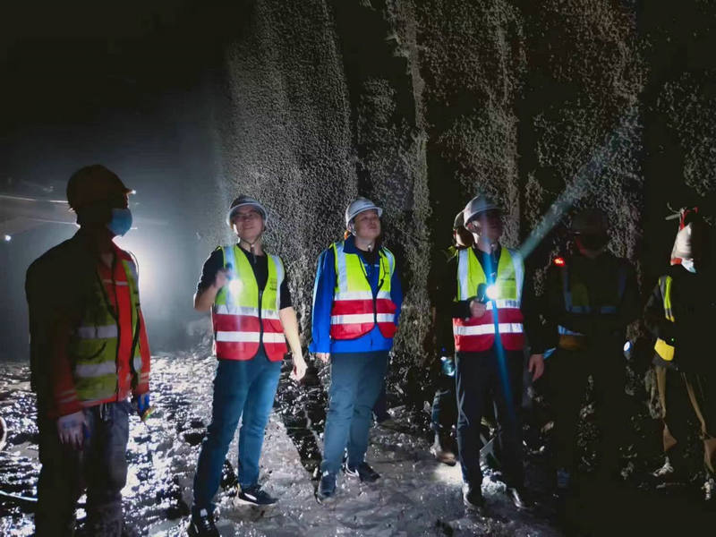 項目部書記韓崇生(右2)與經(jīng)理阮超(右1)在中梁山隧道進(jìn)口帶班“夜查”
