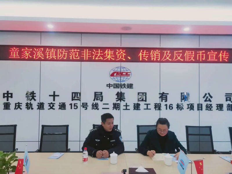 為提醒轄區(qū)全民反詐宣傳工作,提升防范非法集資、傳銷及反假幣詐騙的意識和能力,3月14日,重慶市北碚區(qū)童家溪鎮(zhèn)派出所民警譚崇勇、平安辦公室主任范成敏一行走進中國鐵建重慶軌道交通15號線二期總承包部16標14局項目部開展防范非法集資、傳銷及反假幣詐騙宣傳活動。